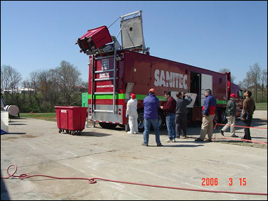 Sanitec’s completely automated lift/load and material handling capabilities, process and engineering controls virtually eliminate occupational exposures such as spill, lifting, and needlestick injuries associated with medical waste handling. Waste can be collected and stored at the point of generation, transported, and treated using a one-container system. No special (e.g. autoclavable) bags or boxes are required. All treatment functions are microprocessor controlled and digitally recorded. Noise and odor are minimized through engineering control features built into the system. Sanitec units have demonstrated an outstanding record for reliability and serviceability, with availability rates of up to 97%.